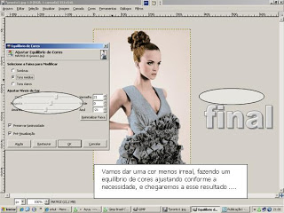 Vamos em CORES > EQUILIBRIO DE CORES e vamos ajustar conforme a necessidade da foto mais ou menos como eu fiz na proxima figura: