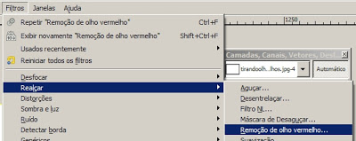 Agora vá no menu “filtros” > “realçar” > “remoção de olho vermelho”.