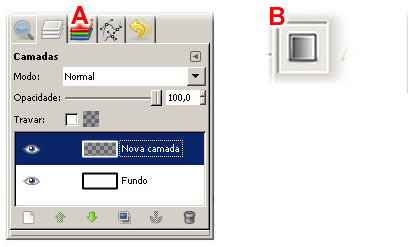 Agora, aplicaremos outro degradê (B). Escolha o Degradê: Sunrise (1), forma: Radial (2). as demais opções ficam conforme a figura (B).