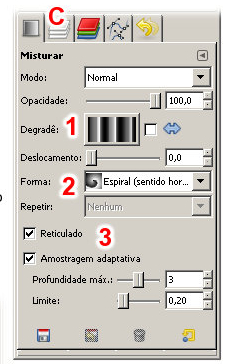Selecione o degradê: Blinds (1) e a Forma: Espiral (sentido horário) (2). Marque : Amostragem adaptativa (3). O resto deverá ficar conforme indica a figura.