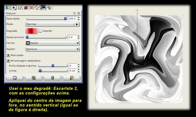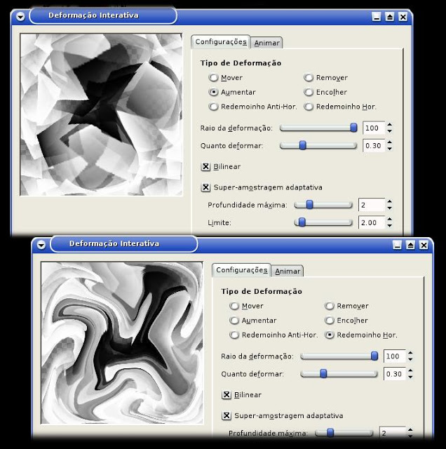 Apliquei o filtro Deformação Interativa, em duas fases: Na primeira, coloquei para “Aumentar”, em Tipo de Deformação e dei uns toques com o mouse no centro da imagem (no quadro de diálogo). Na segunda fase, coloquei para “Redemoinho Horário”,em Tipo de Deformação e dei toques em quatro pontos da imagem: