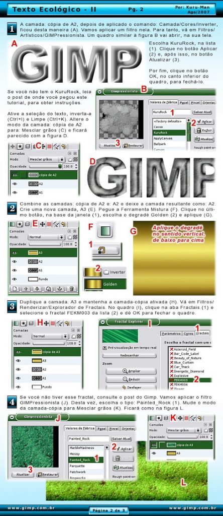 Eu usei a configuração do filtro GIMPressionista, chamada: KuruRock (yeeaah! ) e um fractal chamado FEKM003, do filtro Explorador de Fractais. Para baixá-los e saber como instalá-los no Gimp, veja isto.