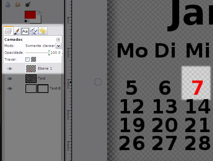 Para pintar um feriado que caia na semana, basta você criar uma nova camada (na imagem acima está com o nome de Ebene 1) e colocar o modo desta camada para somente clarear, feito isso é só pintar os dias, como na imagem de exemplo pintei o dia 7.