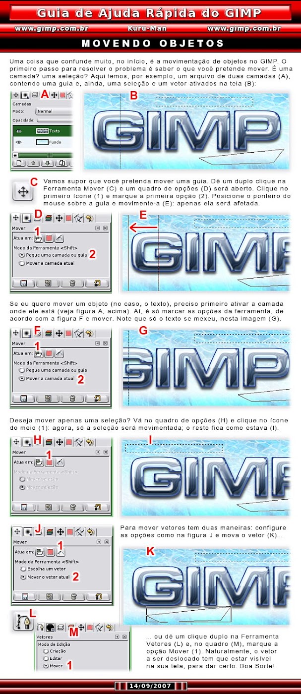 Mover um objeto, seja ele uma camada, uma guia, uma seleção ou um vetor costuma atrapalhar um pouco os iniciantes no GIMP e é justamente disso que trata este meu segundo tutorial da série do Guia.