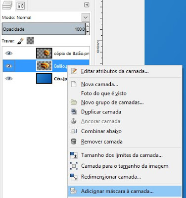 4 – Agora iremos utilizar máscaras nas camadas, na segunda camada do balão, clique com o direito na camada e escolha a opção “Adicionar máscara à camada” e escolha a opção “Preta (Transparência Total)”: